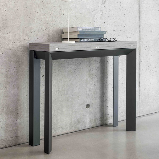 Ножки консоли могут быть из металла, окрашенного в несколько оттенков, а столешница может быть только из меламина. Имеет 2 удлинителя по 30 см из того же материала, что и консоль.
