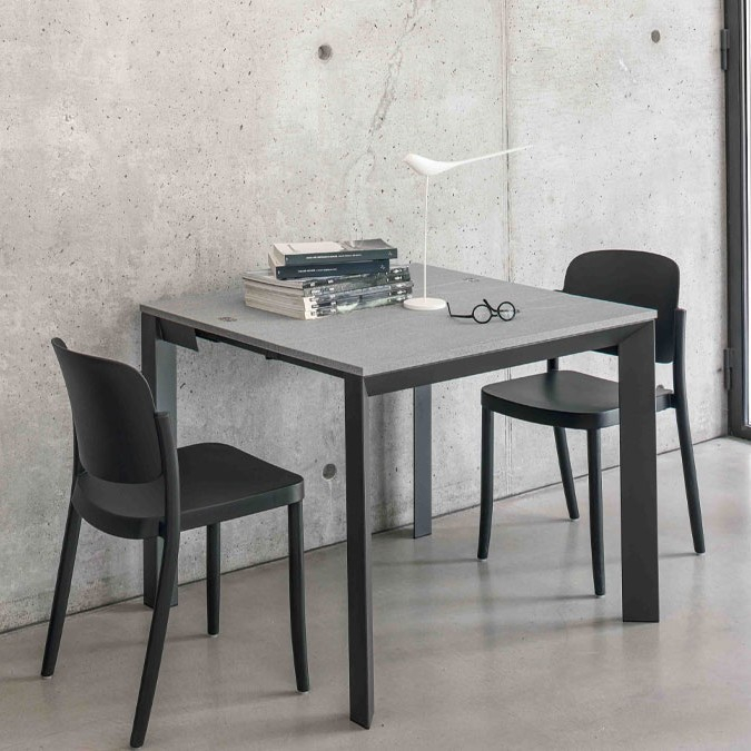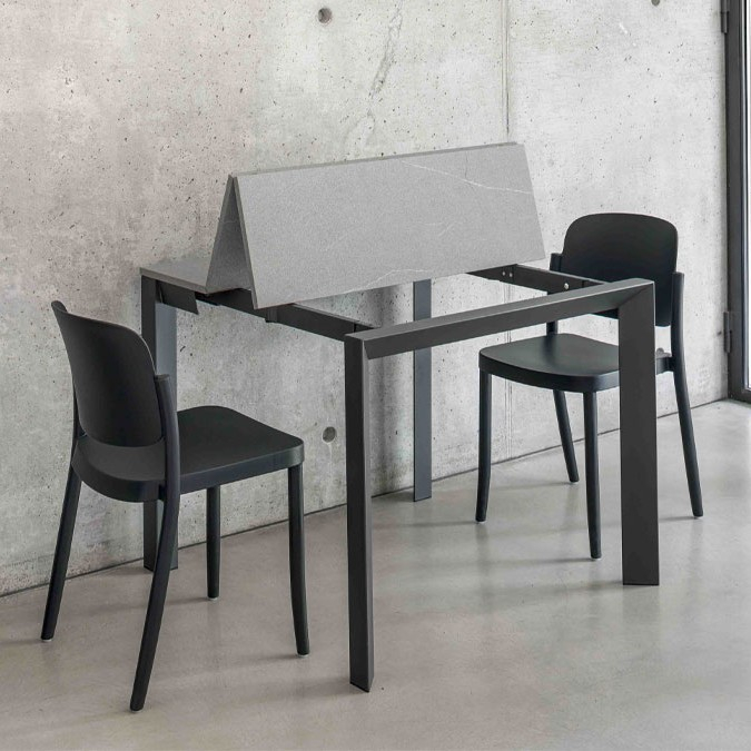 Domino превращается в изысканный и гостеприимный стол, когда его раскладывают. Актуальность консоли обусловлена также непрерывностью материала столешницы, которая накладывается на 3 уровня, гармонично вписываясь в обстановку. Помимо своей функциональной роли обеденного стола, она может спокойно стоять у стены, служа местом для размещения декоративных предметов.