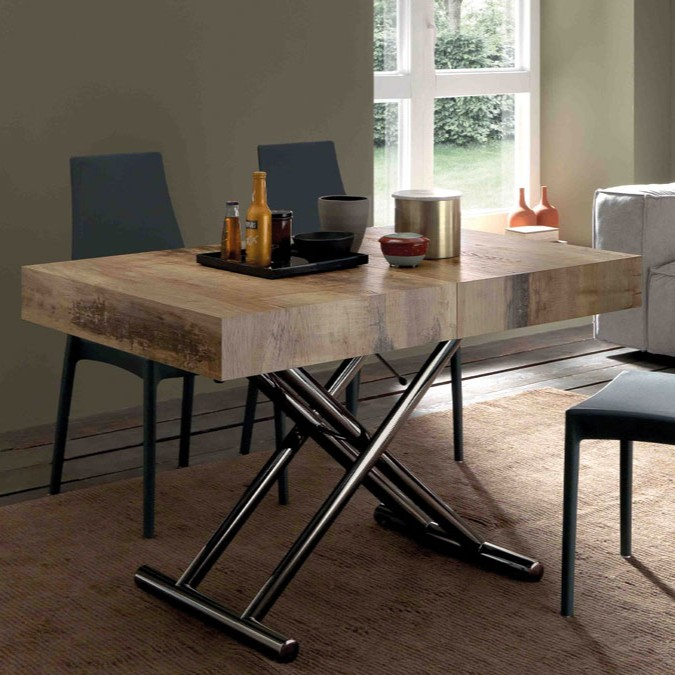 Металлическая структура с оригинальными скрещенными ногами имеет газоподъемное устройство и невидимые колёсики для перемещения стола. Стол регулируется по высоте от 25 до 76 см.