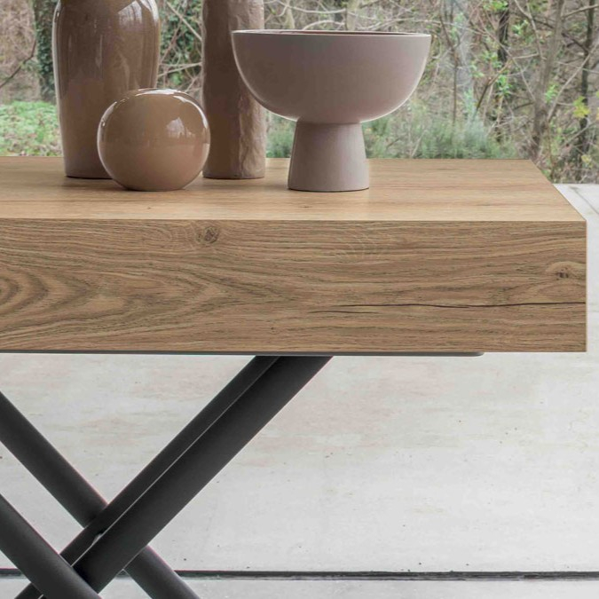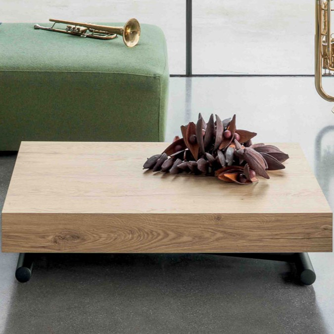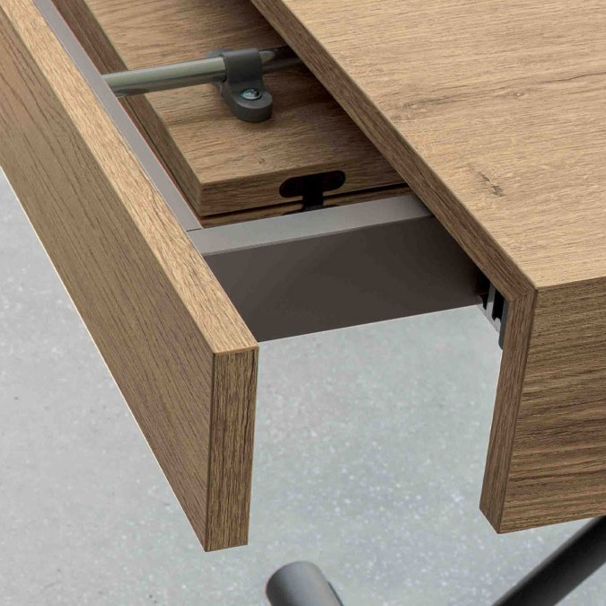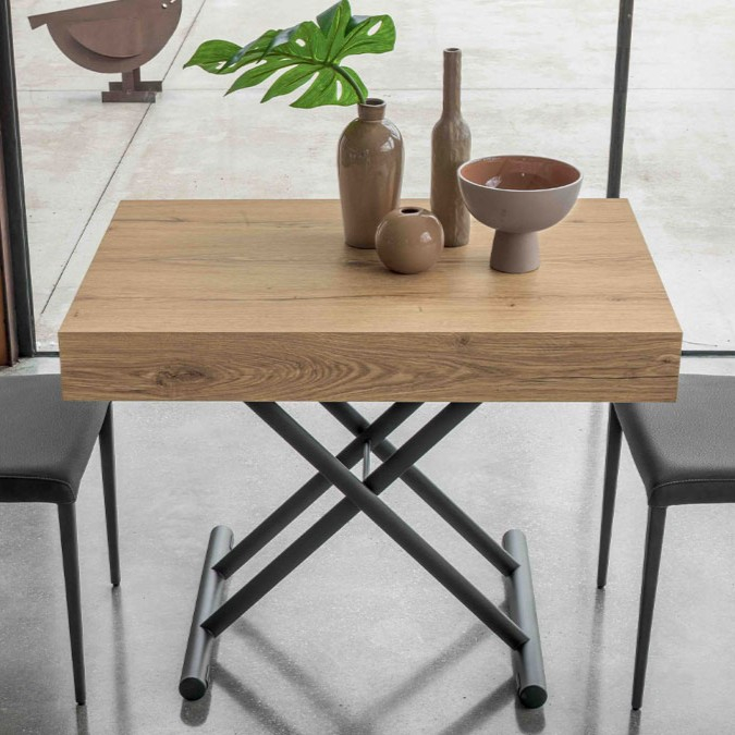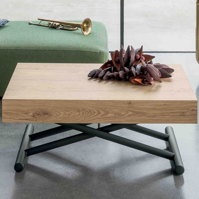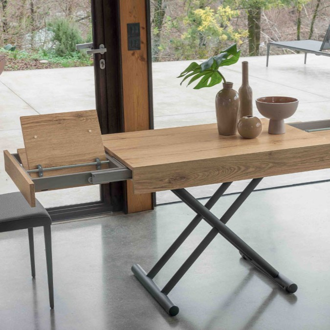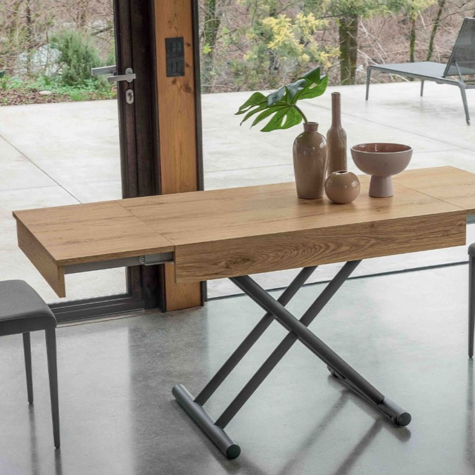 Стол имеет металлическую основу с газлифтным механизмом, высоту которого можно регулировать от 25 см до 84 см. Он оснащен выдвижными колесами для удобства перемещения. Прямоугольная столешница толщиной 12 см содержит два удлинителя книжного типа по 35 см каждая.