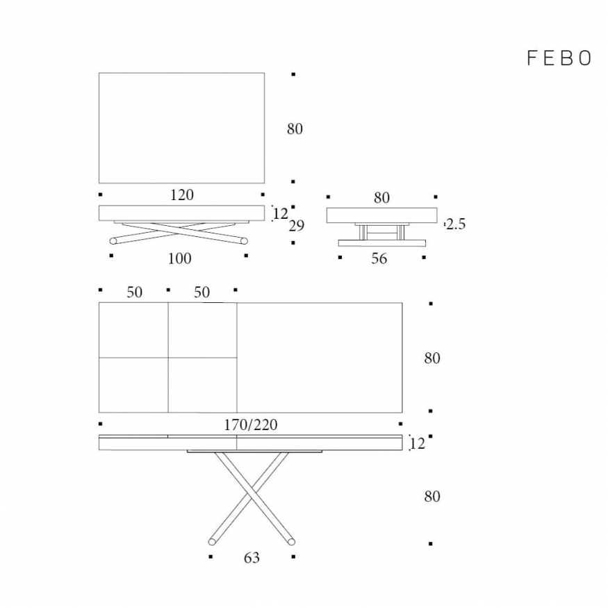 Металлический каркас, газовый подъемный механизм. Стол регулируется по высоте от 28 до 80 см. Синхронизированные механизмы открывания с двумя сложенными надставками. Колеса под основанием.