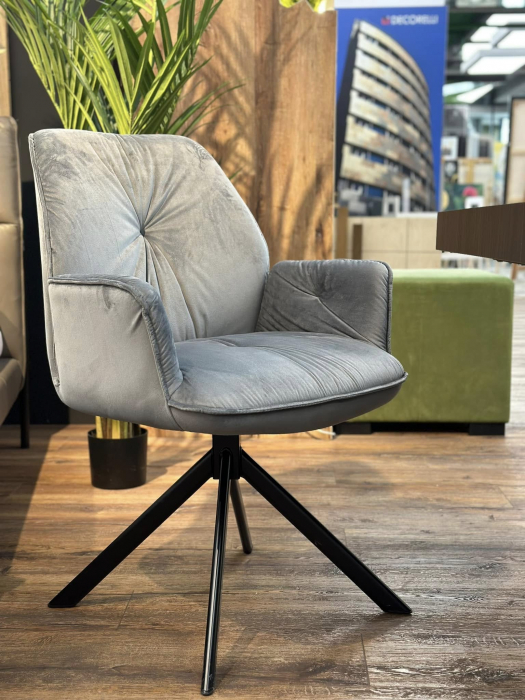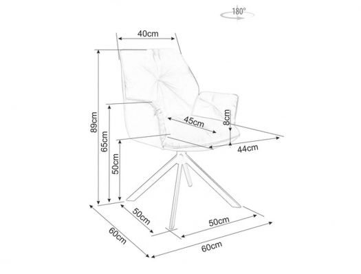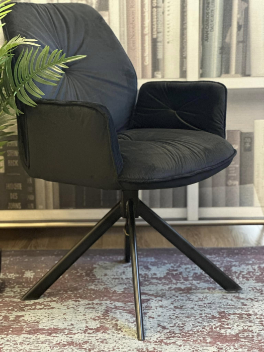 Каркас стула – металлический крест, окрашенный в чёрный матовый цвет. Удобные подлокотники и спинка превращают стул в удобное кресло. Дополнительным практичным решением является вращающееся на 180 градусов сиденье, которое автоматически возвращается в исходное положение.