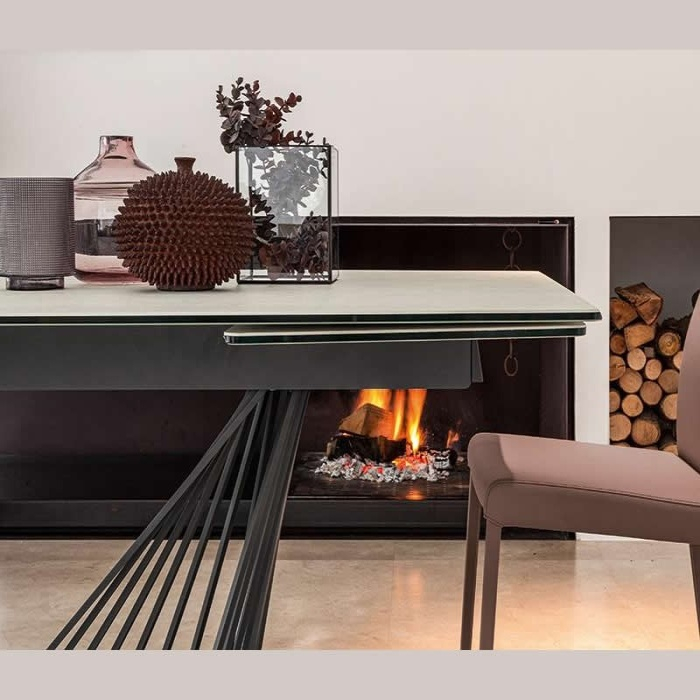 Masa Arpa Extensible cu linii sinuoase, compusă dintr-o serie de corzi metalice de diferite lungimi, întinse conform interacțiunii regulate dintre bază și blatul din sticlă, care exprimă toată muzicalitatea și eleganța sa.