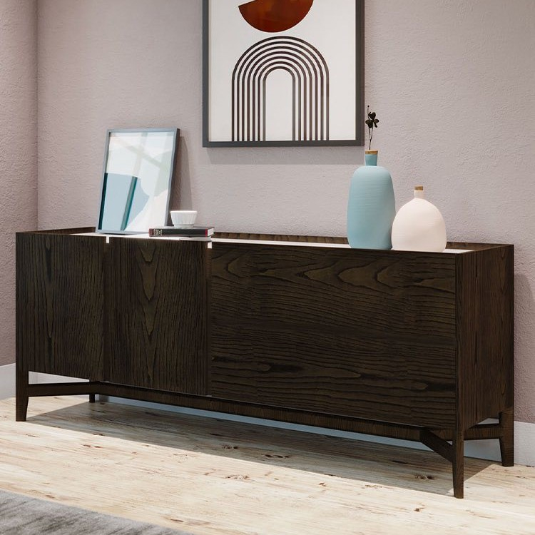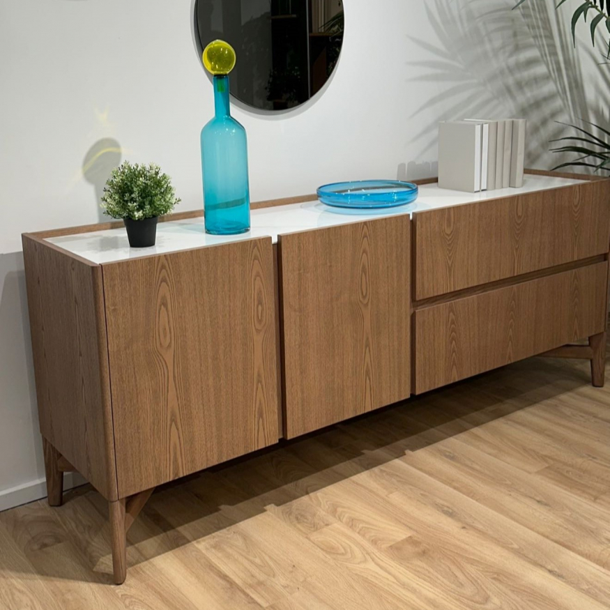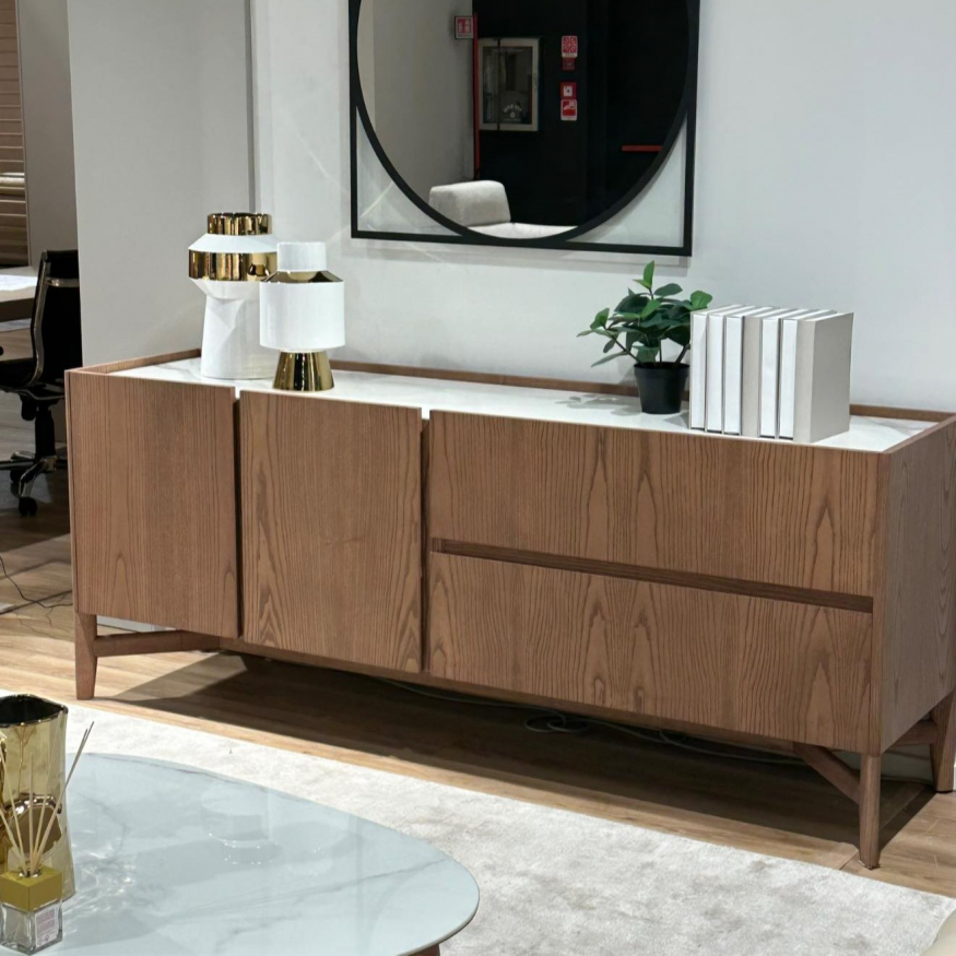 Blatul luxos din marmură sau ceramică se îmbină armonios cu textura caldă a lemnului în finisaj wenge sau nuc, creând un echilibru între eleganță și funcționalitate.
